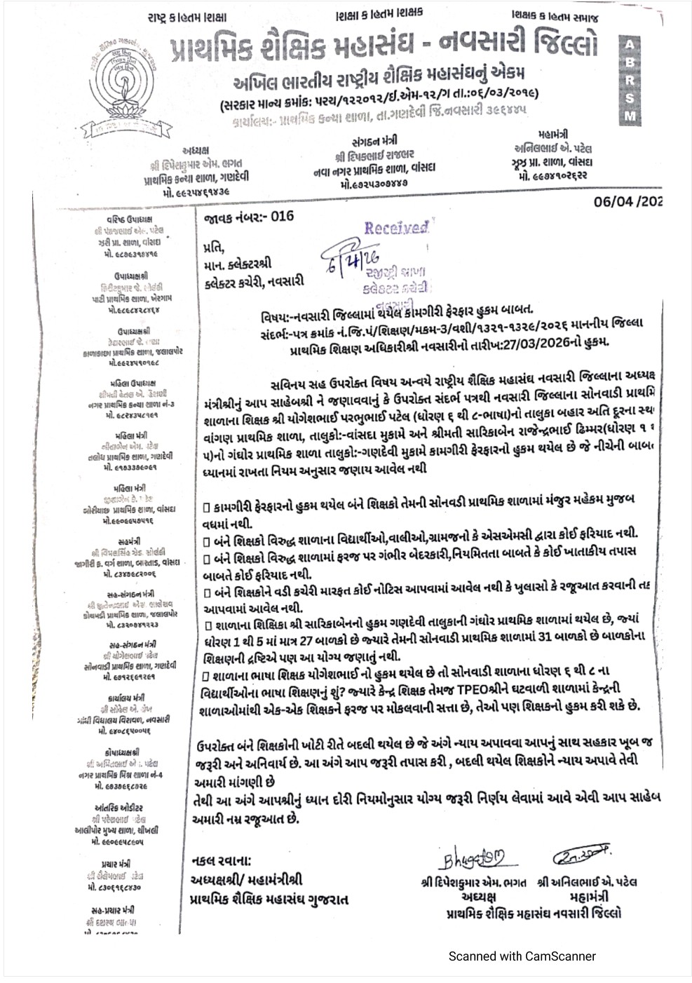 જે બાબતે 06/04/26 ના રોજ પ્રાથમિક શૈક્ષિક મહાસંઘ, નવસારીના હોદ્દેદારો દ્વારા કલેક્ટરશ્રી ને આવેદનપત્ર આપવા માં આવ્યુ..જો ઉચ્ચ સ્તરેથી આ બાબતે તપાસ કરવામાં આવે તો બદલી પાછળના ખરા કારણો બહાર આવી શકે તેમ છે. હાલમાં આ ઘટના નવસારી જિલ્લા પંચાયત અને શિક્ષણ વિભાગમાં ચર્ચાનો વિષય બની છે.